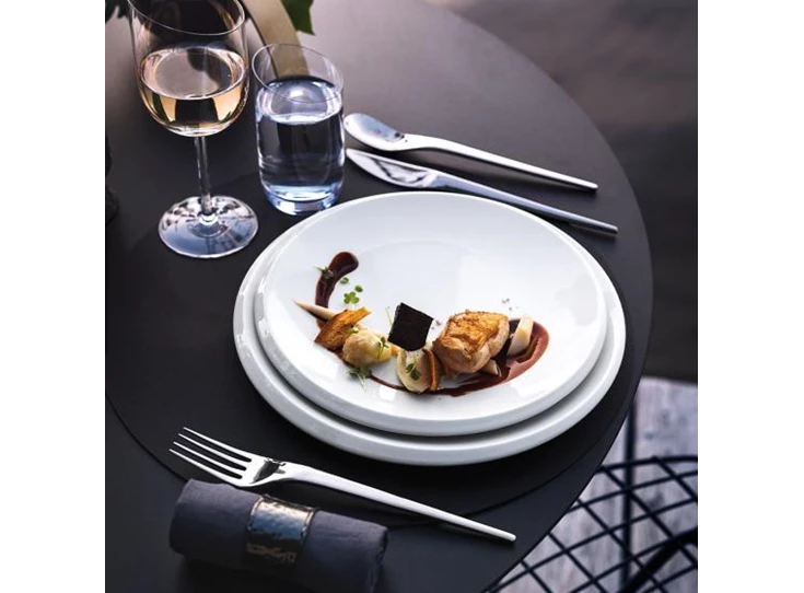 Dit plat bord behoort tot de New Moon collectie van Villeroy & Boch. De collectie kenmerkt zich door een unieke, halvemaanvormige rand die het servies een verfijnde en tijdloze uitstraling geeft. Ideaal voor wie op zoek is naar een modern servies met een unieke uitstraling.