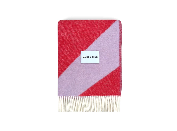 De Swirl plaid van Maison Deux in kleur lilac/scarlet is geweven van Nieuw-Zeelandse wol met franjes aan de korte zijden. Dankzij zijn royale afmetingen is hij groot genoeg om met twee onder te duiken. Naast de warmte die hij je geeft is de plaid tegelijkertijd het perfecte accessoire om je sofa of favoriete stoel wat extra persoonlijkheid te geven.