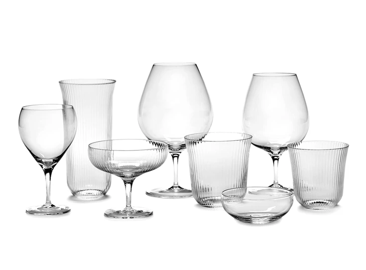 Naast de reeds beschikbare bordencollectie is er een professioneel koffie- en theeservies en een reeks fijn glaswerk. Van wijnglazen over champagnecoupes tot water- en cocktailglazen. Enkelen daarvan in een speciale uitgave in geribbeld glas, waarbij de tere plooien als de baleinen van een walvis stilaan vervagen naar de rand van het glas toe.
