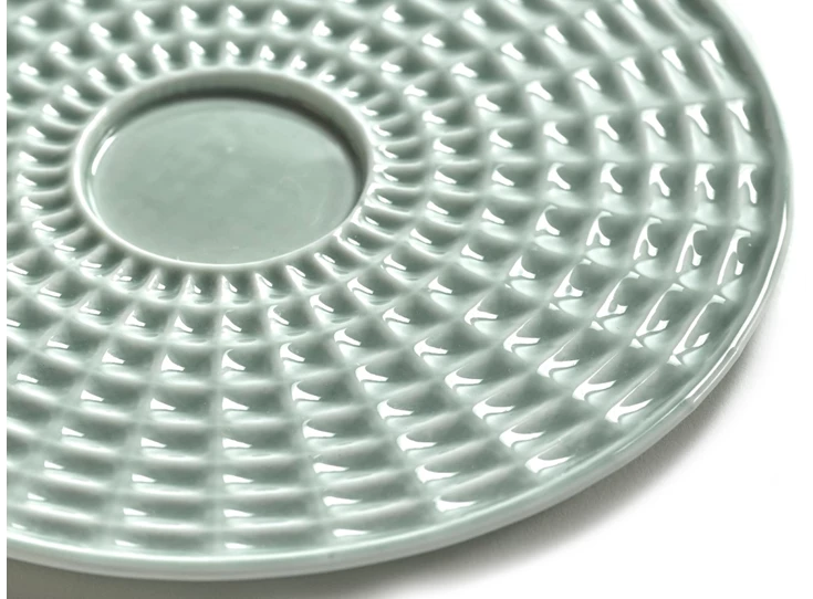 Deze café lungo schotel behoort tot de Nido collectie van Ann Van Hoey voor Serax. Het is een speels, hedendaags servies in bone china die verschillende frisse patronen combineert om een mooi geheel te vormen. Voor de afwerking koos Ann grotendeels voor een doorschijnend glazuur dat het karakter van het porselein benadrukt. Sommige stukken zijn afgewerkt met een jadegroen glazuur die een fris accent toevoegen de eettafel. De collectie is vaatwasserbestendig.