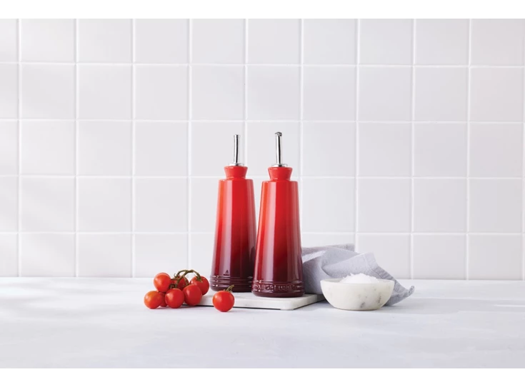 Deze olie- en azijnset in kleur kersenrood van Le Creuset mag niet ontbreken op tafel. Één van de flessen beschikt over het Le Creuset logo en de andere enkel over de iconische Le Creuset ringen, zo hou je de flessen makkelijk uit elkaar.