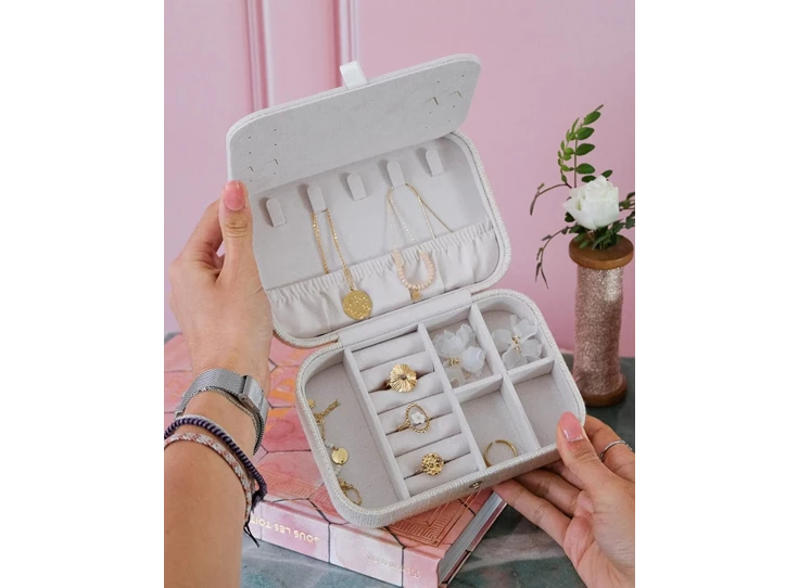 De Brigitte juwelendoos van Maison Scarlett is speciaal ontworpen om mee te nemen op vakantie. De doos is klein genoeg om gemakkelijk in je koffer of handbagage te passen, maar biedt toch voldoende ruimte voor al je essentiële sieraden. De doos is uitgerust met een handig spiegeltje, zodat je altijd en overal je look kunt bijwerken. Daarnaast is de binnenkant bekleed met zacht velours, wat zorgt voor een krasvrije omgeving en je sieraden beschermt tegen slijtage.