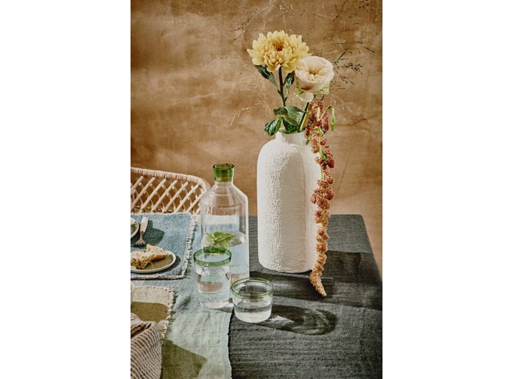 De Tarifa waterfles van Pomax is een stijlvolle en functionele toevoeging aan elke tafelsetting. De fles kenmerkt zich door zijn rijke, groene rand, die een gevoel van luxe en verfijning uitstraalt. Hij is gemaakt van hoogwaardig glas, wat zorgt voor een heldere en pure uitstraling, en is verkrijgbaar in verschillende kleuren. De waterfles heeft een comfortabele vorm, waardoor hij gemakkelijk vast te houden en te schenken is. Het is een perfecte keuze voor het serveren van water, sap of andere dranken tijdens diners of bijeenkomsten.